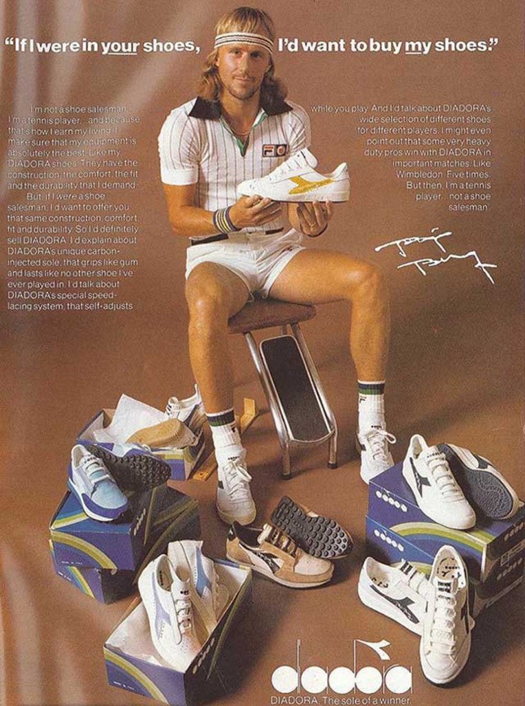 The Italian brand made a ginormous leap in the industry as they started to pair up with sport’s most famous athletes and teams, dressing them for the big stage. Diadora were one of the first companies to create meaningful relationships with players themselves, instead of only the team as a whole. Their innovative, comfortable, and stylish wear made waves in the sports industry, as seen by being the first brand to create tennis shoes with a leather upper, substituting the original fabric upper. Although Diadora’s innovative shoe and partnership with Martin Mulligan would see the brand having a large increase in popularity, it was not until 1976 when they partnered with Bjorn Borg, that Diadora would truly reach premier status.